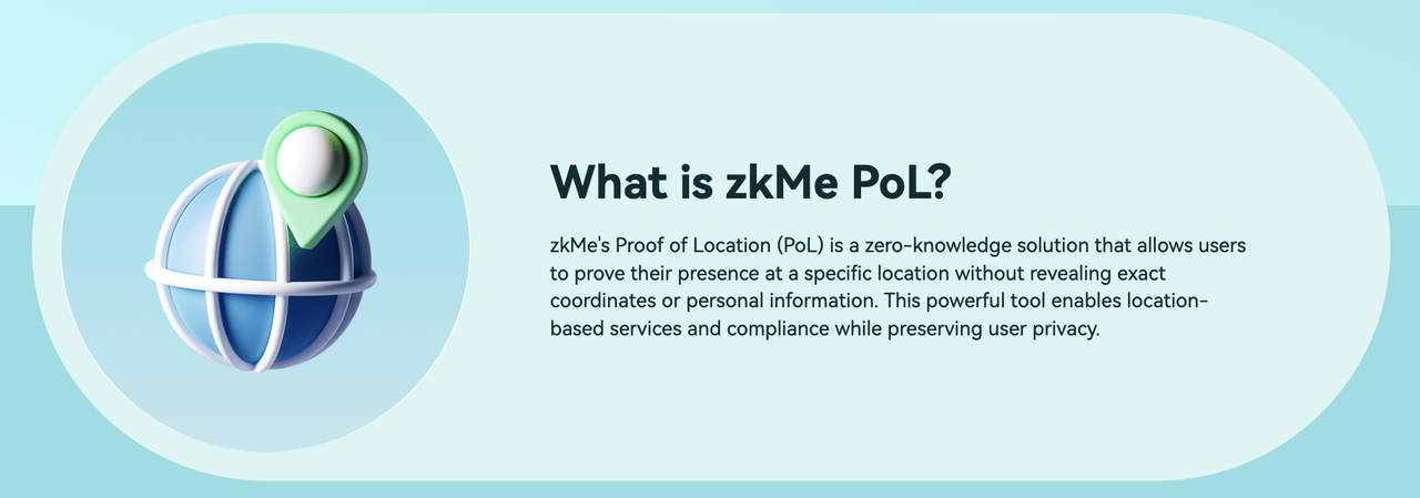 zkMe's Proof of Location (PoL) is a zero-knowledge solution that allows users to prove their presence at a specific location without revealing exact coordinates or personal information. This powerful tool enables location-based services and compliance while preserving user privacy.