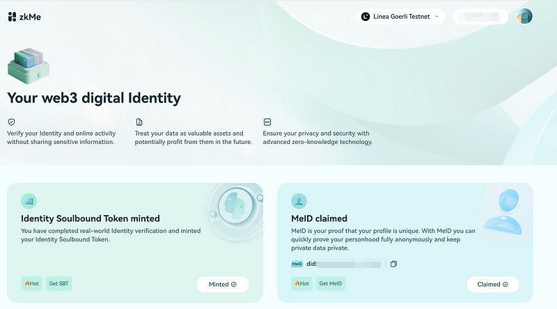 For more information, please refer to this article : Revolutionizing Digital Identity with zkMe & Linea: The Advantages of Identity Soulbound Token | by zkMe network | Jul, 2023 | Medium