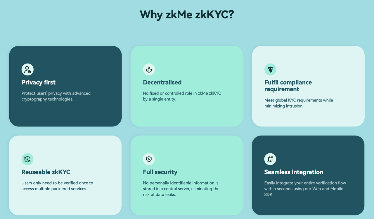 Regulatory Alignment: : zkMe is the world's first Web3-native identity verification solution compliant with FATF KYC and AML recommendations, enabling regulatory compliance while maintaining decentralization.