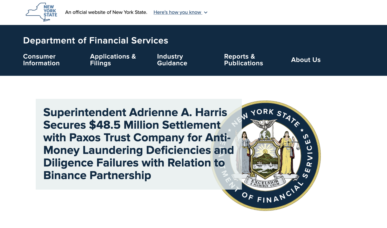 In a landmark enforcement action that sent shockwaves through the stablecoin industry, New York's Department of Financial Services (DFS) imposed a staggering $48.5 million settlement on Paxos Trust Company for anti-money laundering deficiencies and due diligence failures related to its partnership with Binance. The penalty—comprising a $26.5 million fine plus an additional $22 million investment in compliance infrastructure—represents one of the most significant regulatory actions against a stablecoin issuer to date.