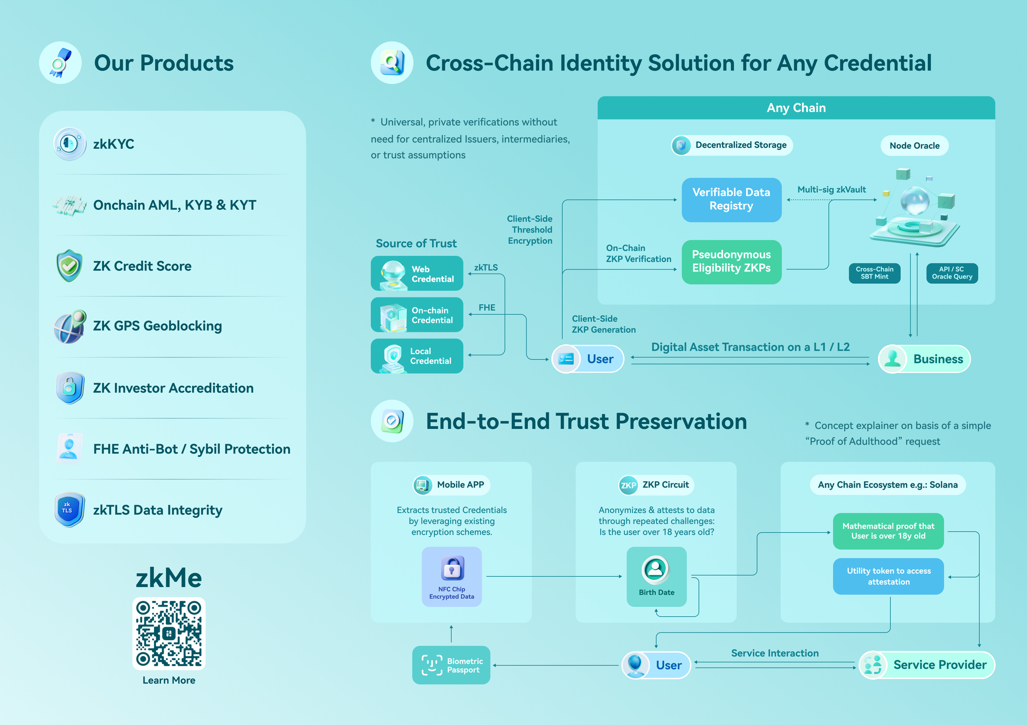 What if you could prove who you are without giving away who you are?Enter zkMe β "The zk-Identity Layer" β a revolutionary Web3-native identity solution that dramatically reduces data breach risks by design. zkMe builds Identity Oracles that leverage the power of zero-knowledge-proofs to enable secure, self-sovereign and private credential verifications.
