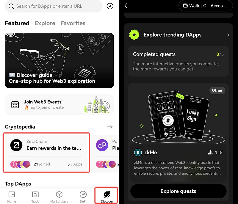 Open the OKX App, and select Wallet from the top toggle. Click the Discover tab at the bottom to access the DApp discover page. Click Cryptopedia: Learn to earn to go to the Cryptopedia page and then find the ZetaChain Section. Tap to enter the ZetaChain topic page, and find zkMe quests to start.