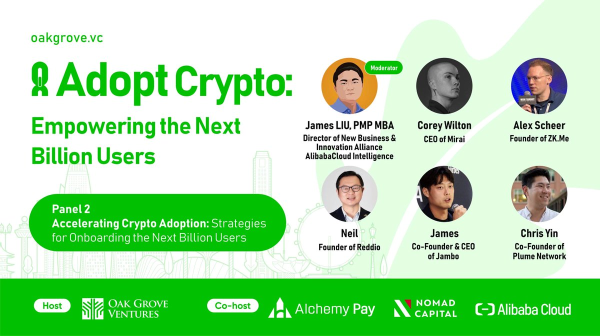 Rounding out our Token2049 engagements, zkMe's Founder & CEO, Alex Scheer, brought his expertise to the "Adopt Crypto: Empowering the Next Billion Users" event. Hosted by Oak Grove Ventures and co-hosted by industry leaders AlchemyPay, Nomad Capital, and Alibaba Cloud, this gathering focused on strategies to accelerate crypto adoption.